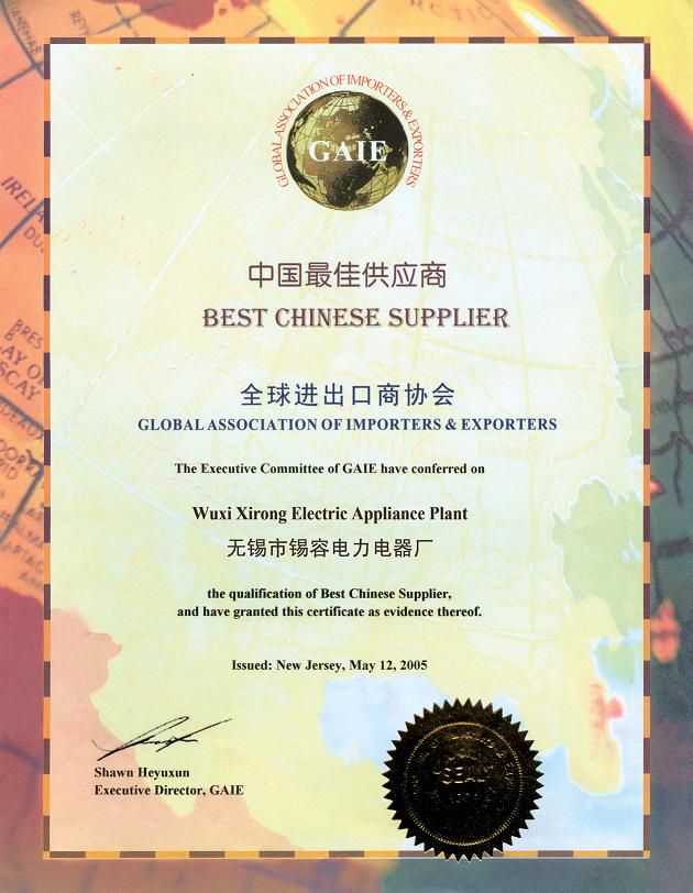無錫市錫容電力電器有限公司,2005年,7月12號被全球進出口商協會評為中國最佳供應商。